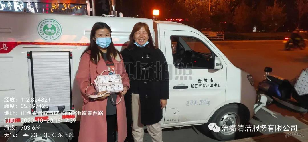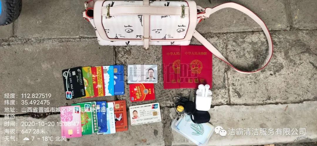 10月20日下午3點左右,晉城市潔霸清潔服務(wù)股份有限公司保潔部環(huán)衛(wèi)經(jīng)理李通和工人在城區(qū)南街街道景西路段進行街道清洗作業(yè)時,忽然看見晉城農(nóng)商銀行門前的綠化帶里有一個女士挎包,忙叫環(huán)衛(wèi)工人郭志云把挎包撿了起來。當(dāng)時就考慮到失主丟失挎包以后一定很著急,在同事的共同見證下他們打開挎包,經(jīng)過查看,發(fā)現(xiàn)挎包內(nèi)有一張王女士的身份證、社?般y行卡數(shù)張,還有結(jié)婚證、鑰匙、耳機、富士康工牌等物品。憑借富士康工牌上的工號,他們給富士康打電話聯(lián)系到了失主,后由環(huán)衛(wèi)主管秦彩鳳將挎包交到失主手中。收到失而復(fù)得的挎包,王女士又驚又喜,感激萬分。