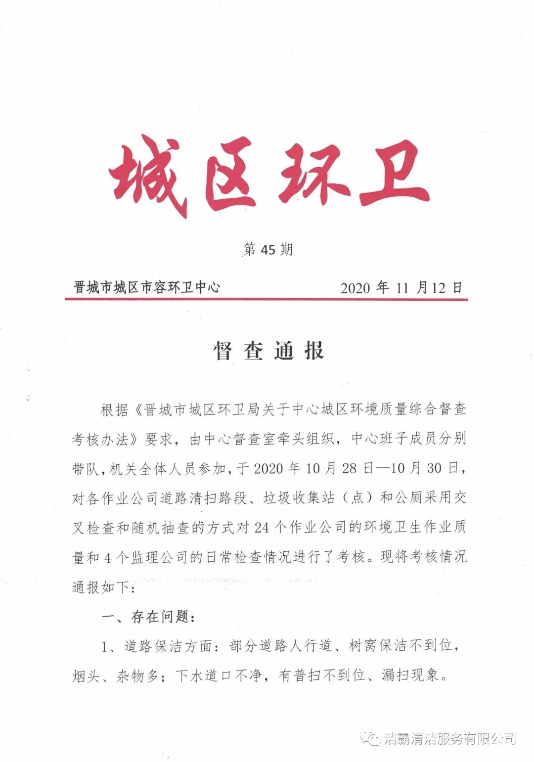 2020年10月28日—10月30日,晉城市城區(qū)市容環(huán)衛(wèi)中心由中心督查室牽頭組織,中心班子成員分別帶隊(duì),機(jī)關(guān)全體人員參加,對(duì)各作業(yè)公司道路清掃路段、垃圾收集站(點(diǎn))和公廁采用交叉檢查和隨機(jī)抽查的方式對(duì)24個(gè)作業(yè)公司的環(huán)境衛(wèi)生作業(yè)質(zhì)量和4個(gè)監(jiān)理公司的日常檢查情況進(jìn)行了考核。晉城市潔霸清潔服務(wù)股份有限公司所屬的環(huán)衛(wèi)四公司分?jǐn)?shù)最高,名列第一。