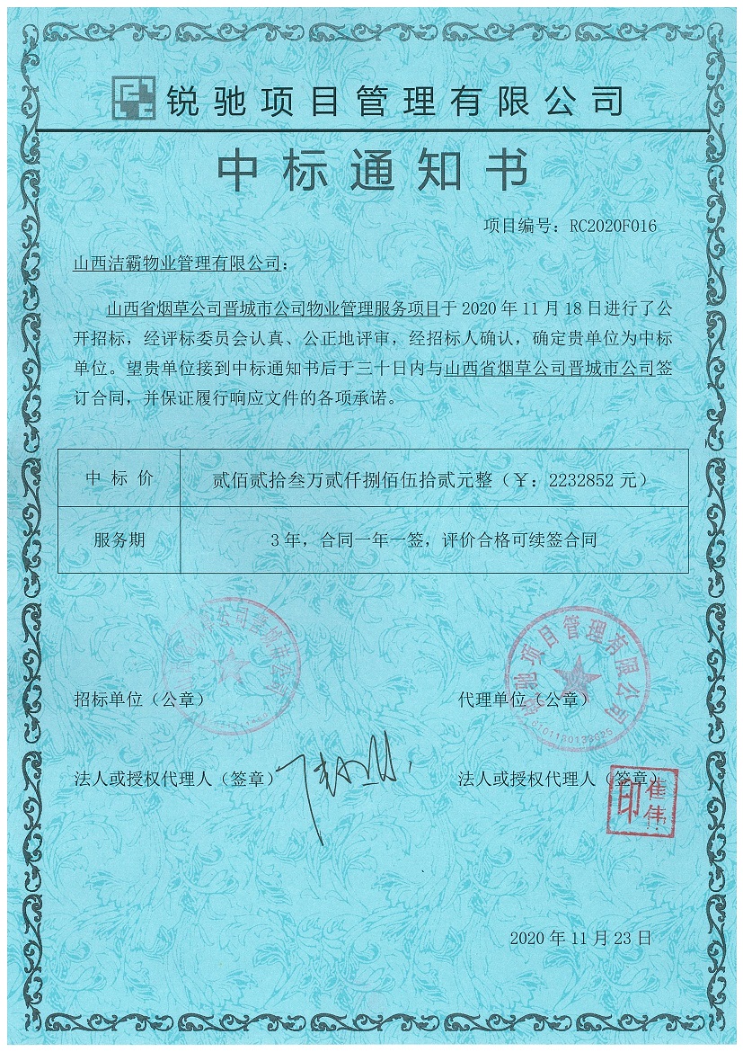 2020年11月18日,山西省煙草公司晉城公司物業(yè)管理服務(wù)項(xiàng)目開標(biāo)會(huì)議在晉城市文昌東街1560號(hào)南環(huán)供電營業(yè)站一樓東會(huì)議室舉行。在經(jīng)過幾個(gè)小時(shí)的激烈競(jìng)標(biāo)過程評(píng)選后,從開標(biāo)室傳出喜訊,山西潔霸物業(yè)管理有限公司成功中標(biāo)。中標(biāo)金額為2232852元,合同期一年。此次中標(biāo)為潔霸物業(yè)今年的業(yè)績(jī)?cè)偬硪还P輝煌。