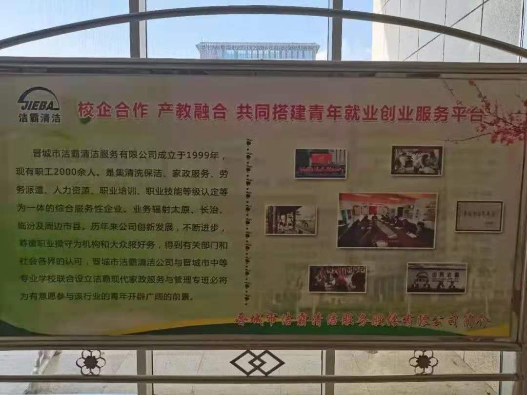 5月25日,是晉城市中等專業(yè)學(xué)校的“家長開放日”。活動當天,晉城潔霸清潔服務(wù)股份有限公司攜手晉城市中等專業(yè)學(xué)校,共同開展了“校企合作,產(chǎn)教融合, 共同搭建青年就業(yè)創(chuàng)業(yè)服務(wù)平臺”主題活動。