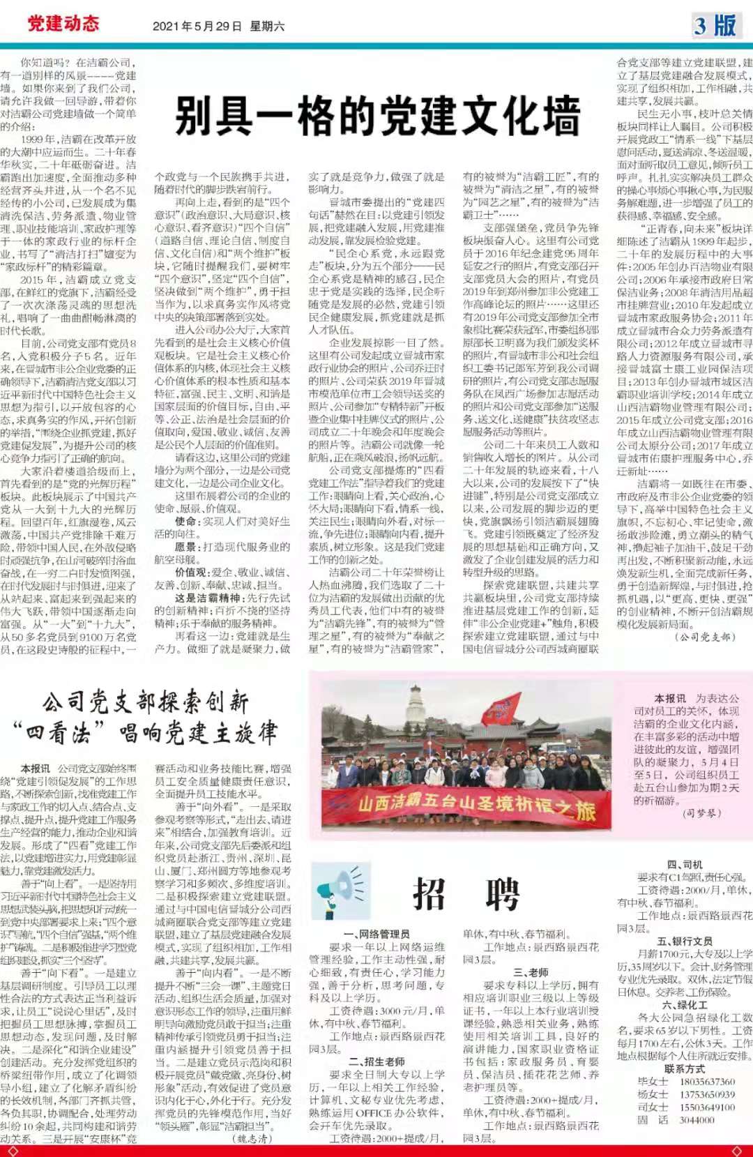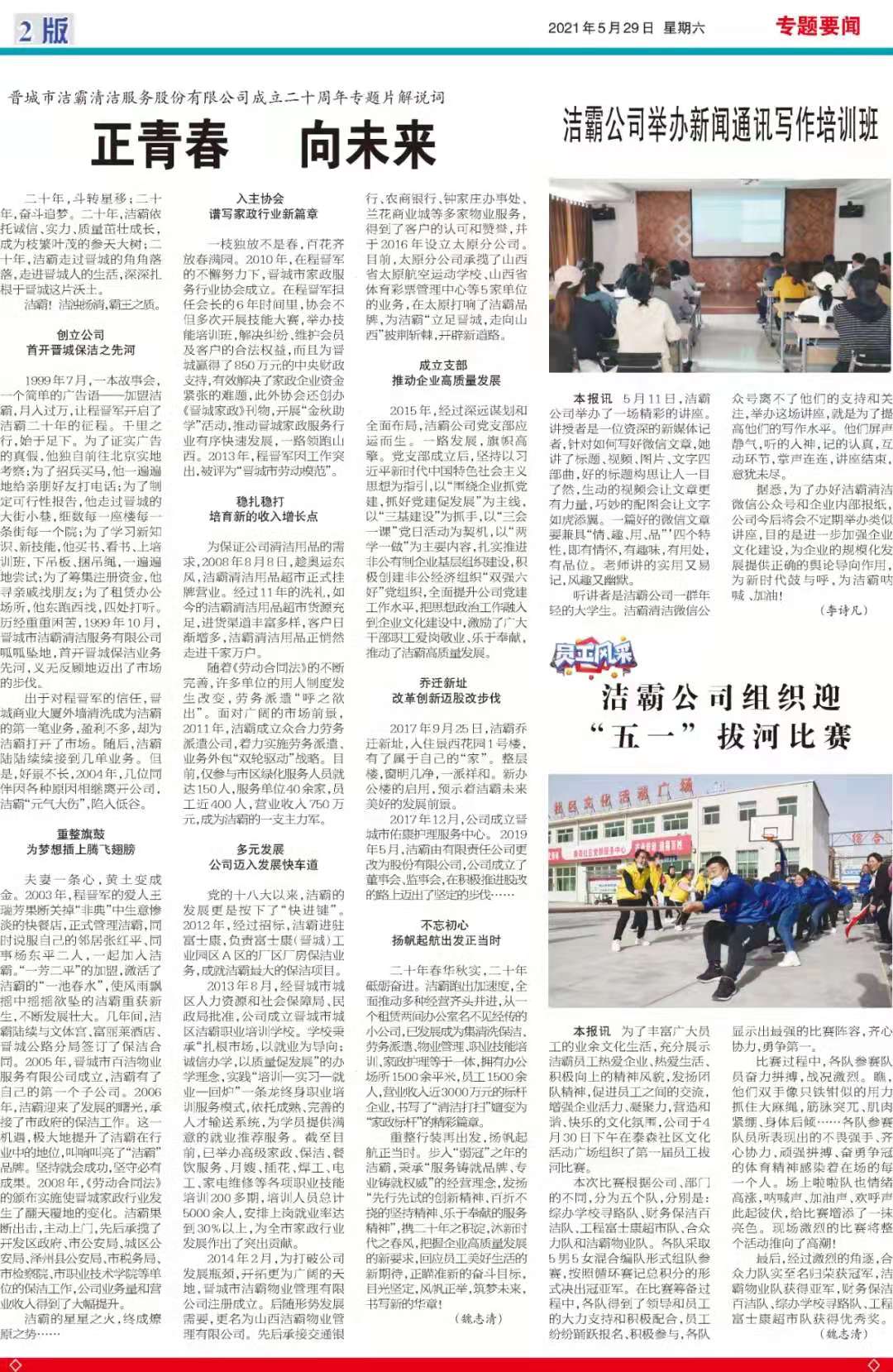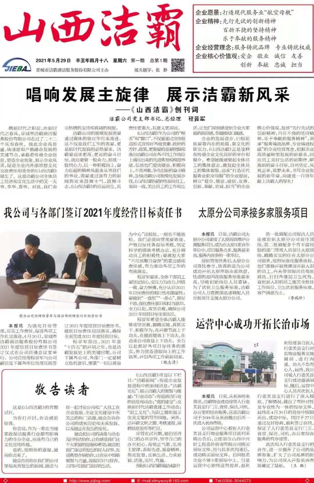 今天是2021年5月29日,經(jīng)過(guò)一個(gè)多月的緊張籌辦,《山西潔霸》報(bào)紙終于創(chuàng)刊啦!這是潔霸人的一件大喜事,也是潔霸人的驕傲!伴隨著《山西潔霸》紙質(zhì)版的內(nèi)部發(fā)行,電子版也同步與你見面了。希望你能通過(guò)這個(gè)宣傳窗口,更好地走近潔霸,了解潔霸,關(guān)注潔霸,支持潔霸。