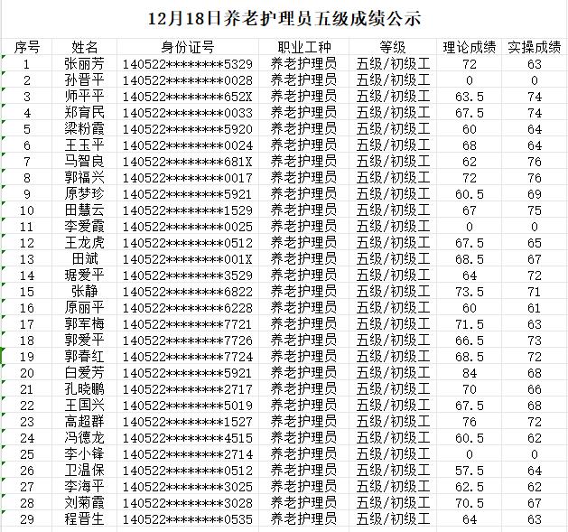 晉城市潔霸清潔服務(wù)股份有限公司職業(yè)技能等級認(rèn)定中心現(xiàn)將2023年12月18日認(rèn)定人員成績公示如下: