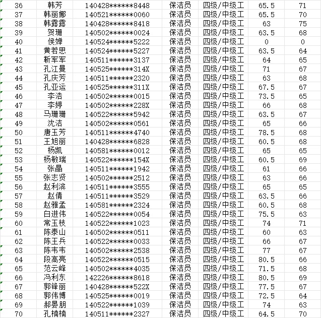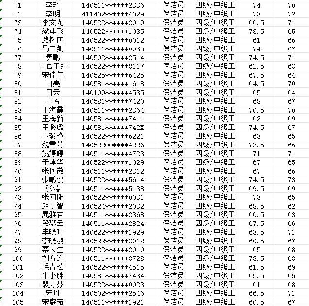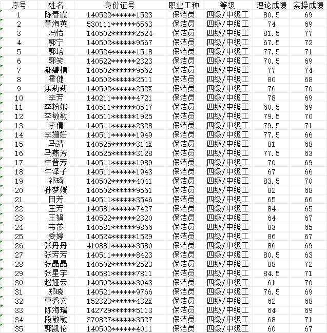 晉城市潔霸清潔服務(wù)股份有限公司職業(yè)技能等級認(rèn)定中心2024年1月20日第2批保潔員中級認(rèn)定人員成績公示
