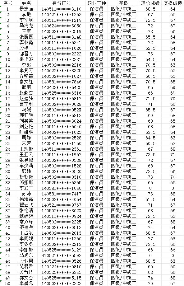 晉城市潔霸清潔服務(wù)股份有限公司職業(yè)技能等級認(rèn)定中心現(xiàn)將2024128日認(rèn)定人員成績公示如下: