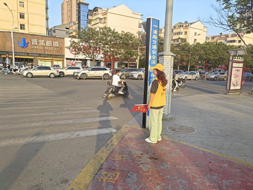 活動中,支部黨員、入黨積極分子志愿者身穿志愿者馬甲,手持文明勸導旗子,化身為“交通安全守護員”。她們站在斑馬線兩側(cè),對行人闖紅燈、橫穿馬路、不走斑馬線等不文明行為進行勸阻,引導電動車等非機動車輛按信號燈指示行駛、不越線停車、不逆行,對非機動車走機動車道、闖紅燈、逆行、不戴頭盔等交通違法行為進行勸導糾正,糾正制止不文明交通行為,宣傳勸導廣大市民遵守交通法規(guī)和規(guī)則,維護交通文明和社會秩序,自覺養(yǎng)成良好的文明交通習慣,時刻牢記遵法出行,確保自身及他人安全,共同營造平安、和諧、有序的道路交通環(huán)境。