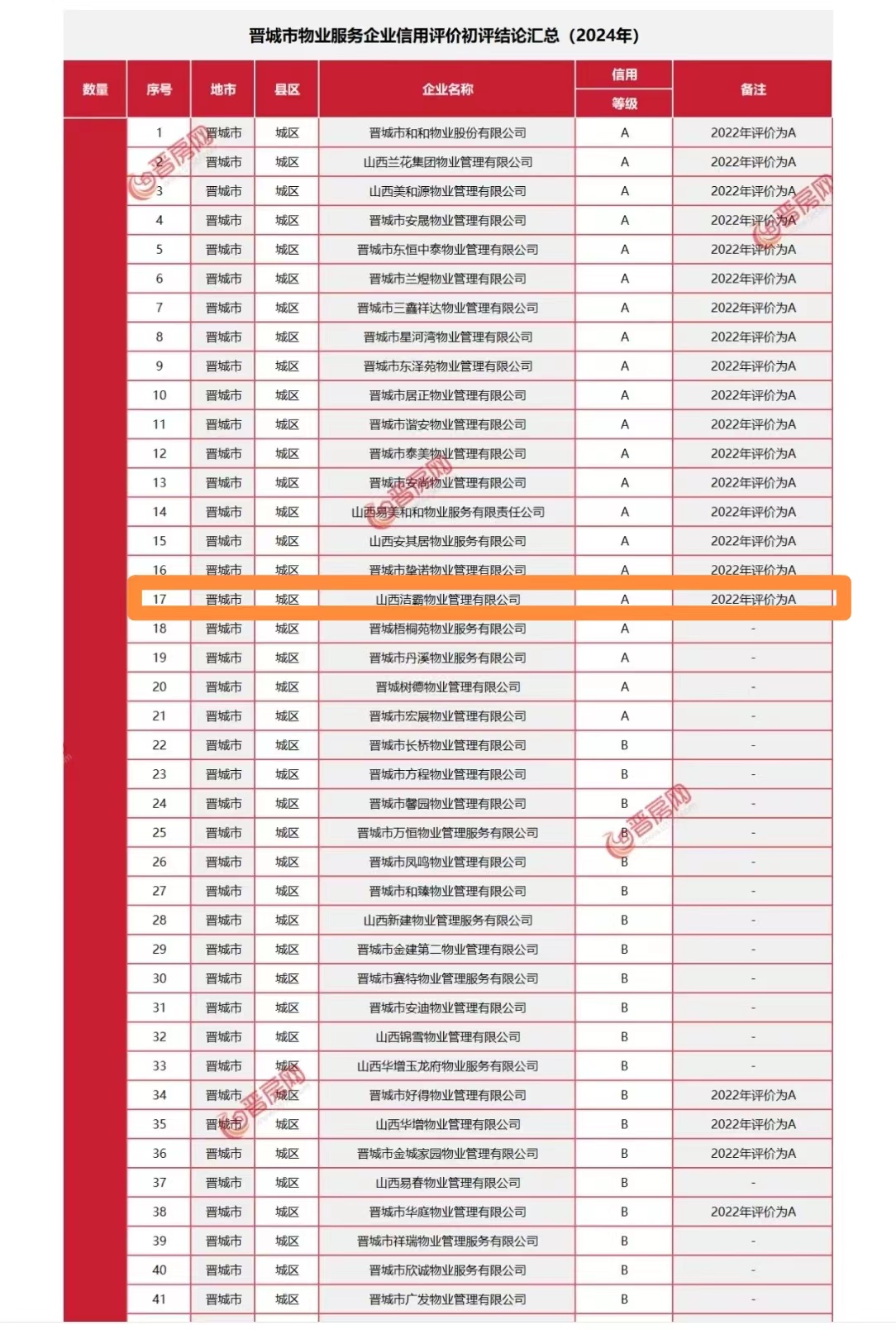 日前,山西省住房和城鄉(xiāng)建設(shè)廳發(fā)布了2023年度房地產(chǎn)企業(yè)信用評價結(jié)果的通知,根據(jù)通知顯示,晉城市共有200家物業(yè)服務(wù)公司參加評定,晉城市潔霸物業(yè)管理有限公司獲得2023年度物業(yè)服務(wù)企業(yè)信用等級A級認證。在本次考評結(jié)果中,潔霸物業(yè)光榮上榜,是對其物業(yè)服務(wù)品質(zhì)的充分肯定。 |