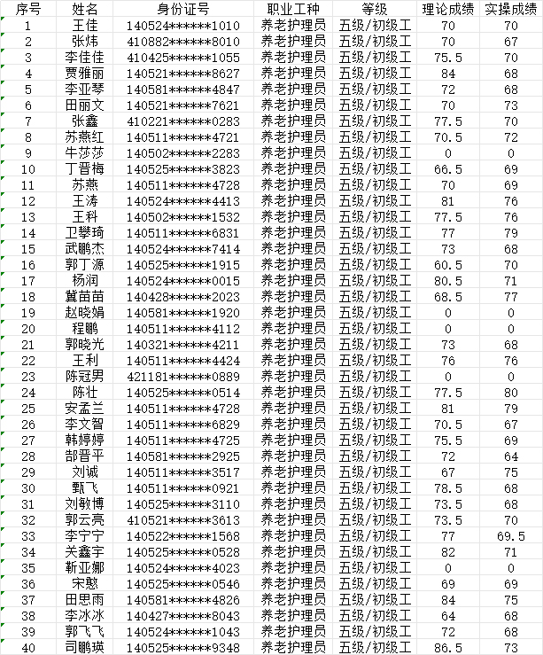 晉城市潔霸清潔服務(wù)股份有限公司職業(yè)技能等級(jí)認(rèn)定中心2024年7月14日第21批養(yǎng)老護(hù)理員初級(jí)認(rèn)定人員成績公示