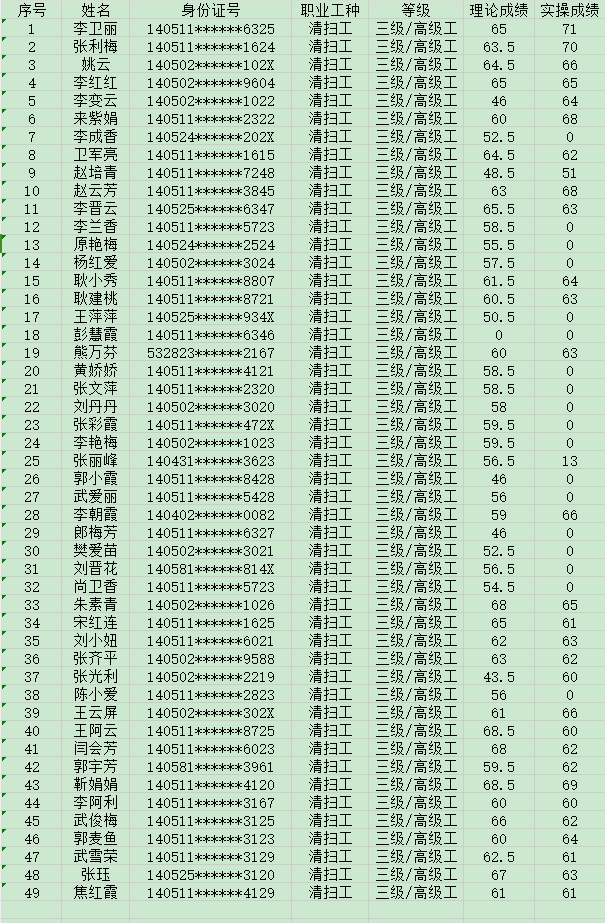 晉城市潔霸清潔服務(wù)股份有限公司職業(yè)技能等級認(rèn)定中心現(xiàn)將2024年8月3日認(rèn)定人員成績公示如下: