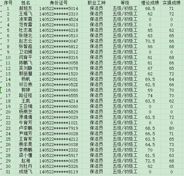 晉城市潔霸清潔服務(wù)股份有限公司職業(yè)技能等級(jí)認(rèn)定中心2024年8月24日第32批保潔員初級(jí)認(rèn)定人員成績(jī)公示