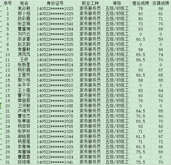 晉城市潔霸清潔服務(wù)股份有限公司職業(yè)技能等級認(rèn)定中心2024年8月31日第33批家政服務(wù)員初級認(rèn)定人員成績公示